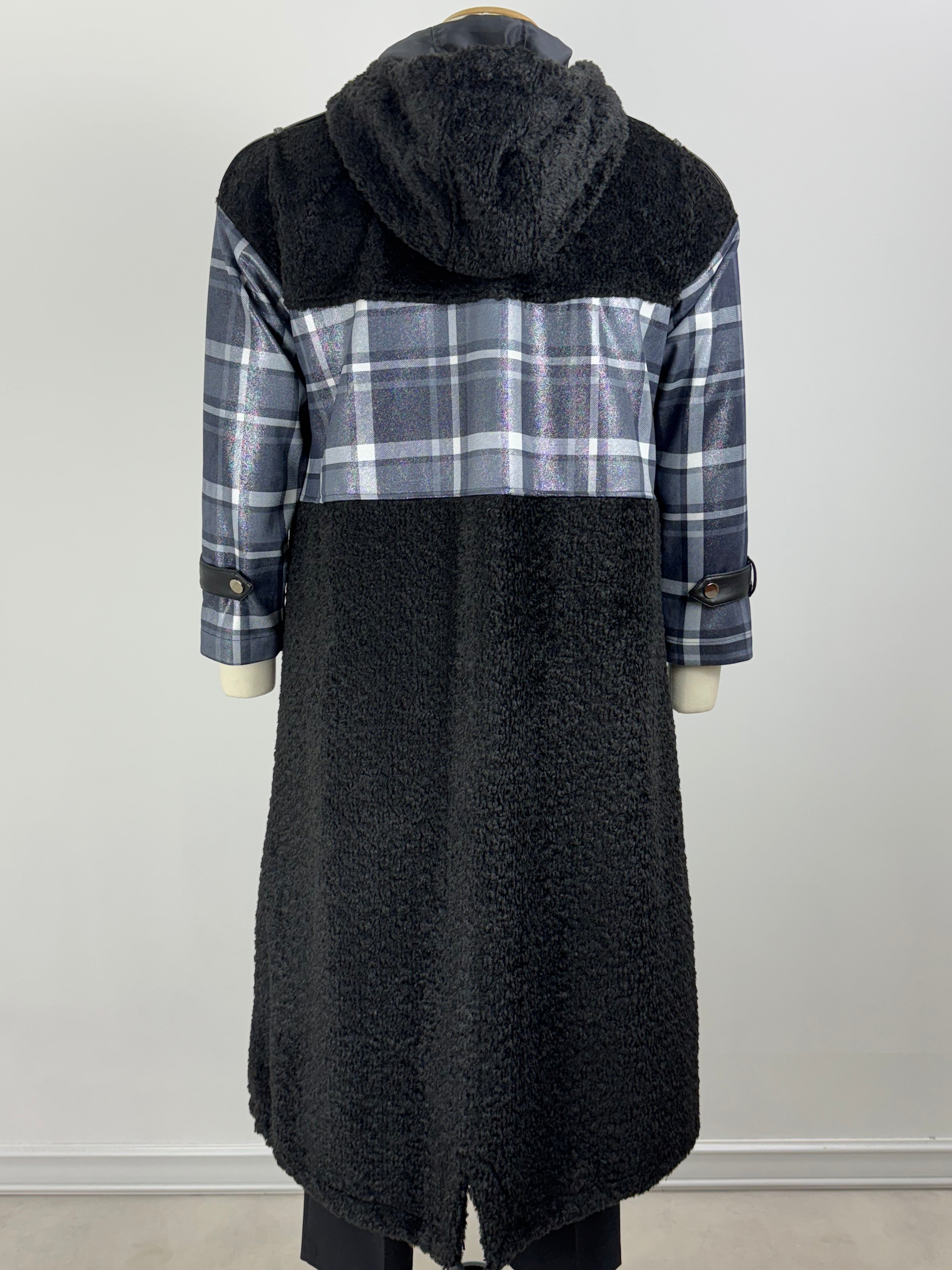 Peluş ekose kombinli uzun kaban.