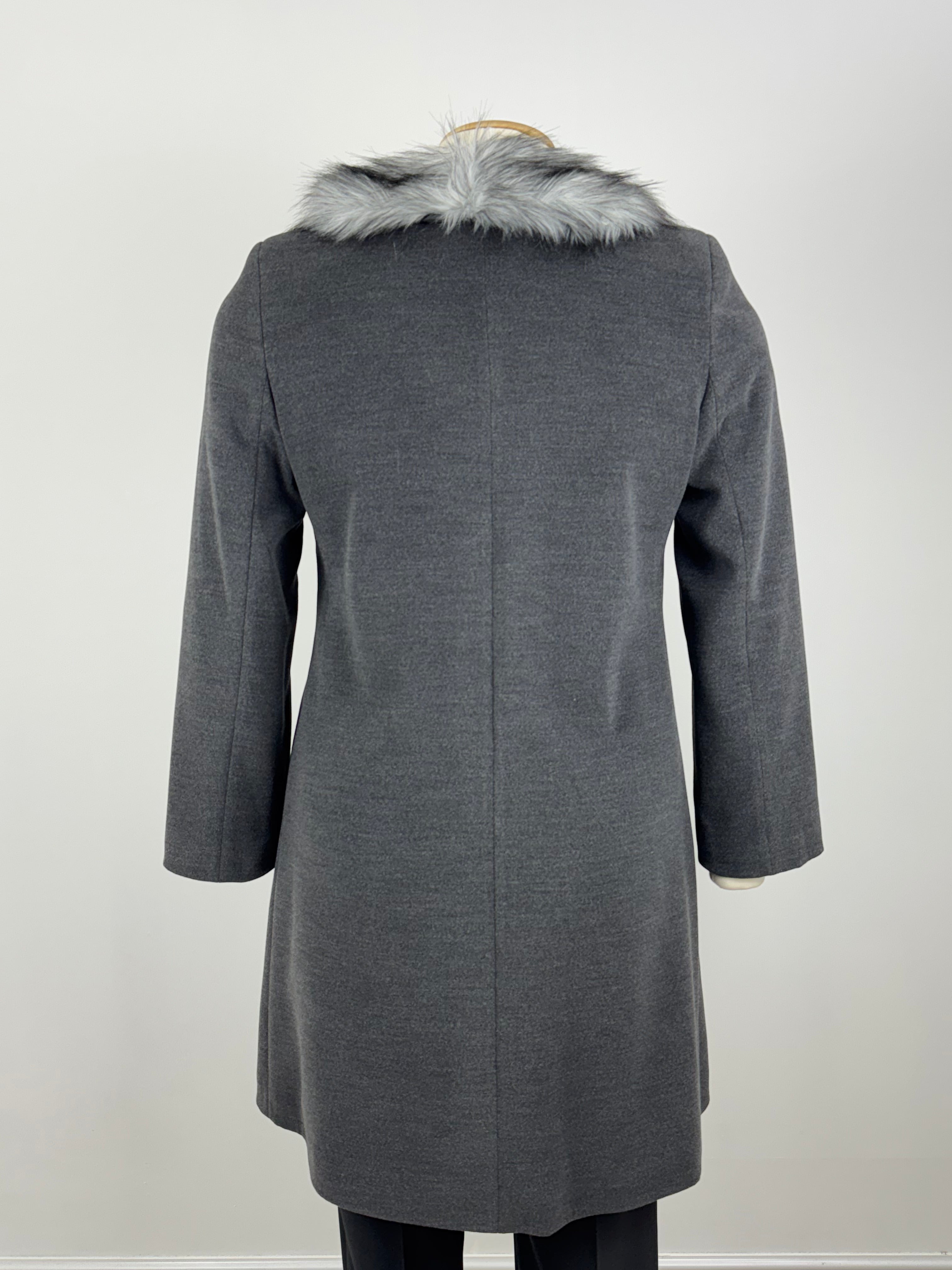 Uzun metal düğme yaka kürklü kaşe kaban.
