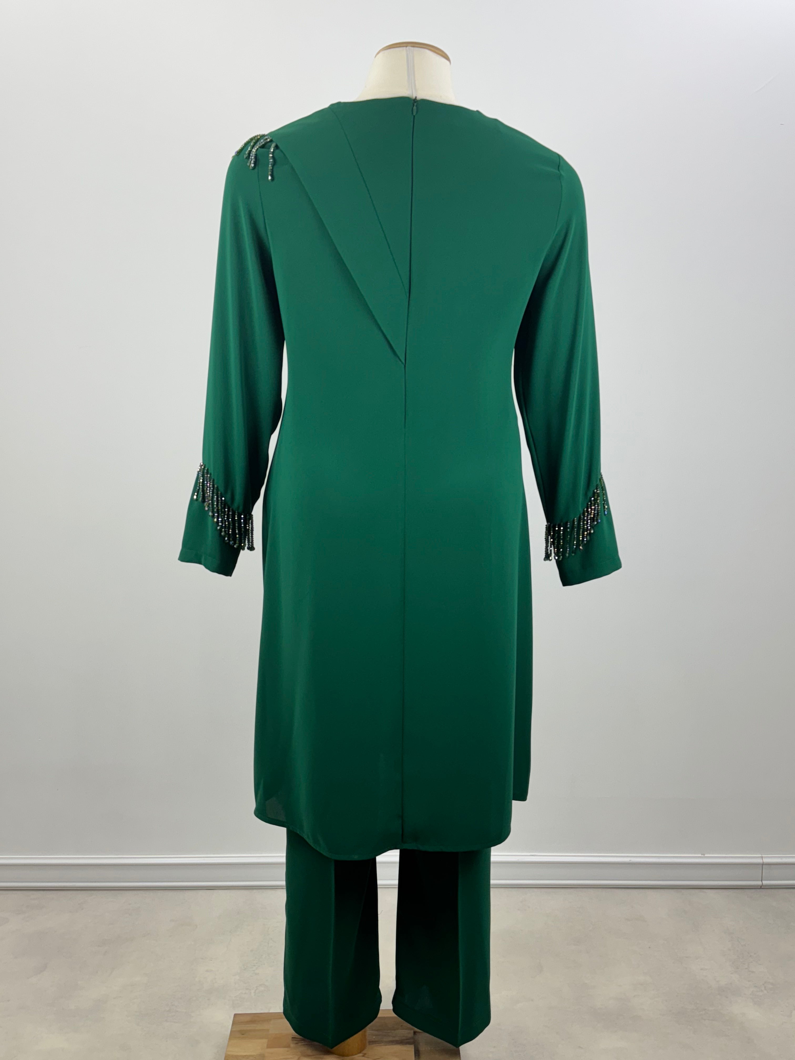 Suzana kumaş, kristal taşlı abiye pantolonlu takım. Akıcı olduğu için bir beden küçük gösterir ve hatları göstermez.